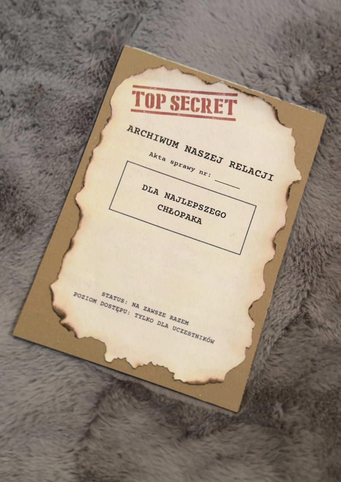 „Tylko dla oczu uprawnionych osób”. Tu jest miejsce na żartobliwe, ale czułe rzeczy: „Tajne nawyki podejrzanego nr 1”, „Operacja: Rozśmiesz mnie” i „Raport: Sekretne zdolności”. Ta sekcja dodaje lekkości, a jednocześnie odkrywa Wasze wewnętrzne „memy”.